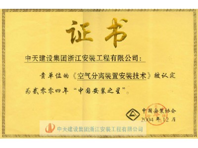 • “空氣分離裝置安裝技術”榮獲2004年度“中國安裝之星”